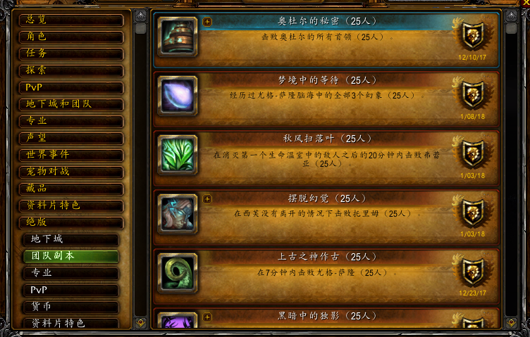 现在奥杜尔副本自从在7.0版本时,因巫妖王版本时光周的加入,曾经的25人模式,改成了只剩10人的普通模式,所以很多25人成就也就绝版了。