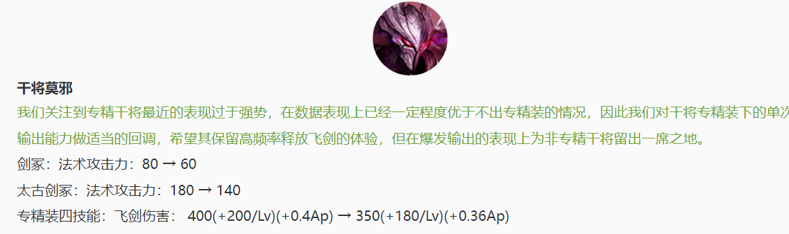 22年9月1日开始,干将莫邪就走了和以前一样的老路,高分段常年垫底,且出场率很低,那一刀削弱了低级/高级专精装的法强20/40点,同时从基础到成长,再到ap加成,全方位削弱了大招的伤害。