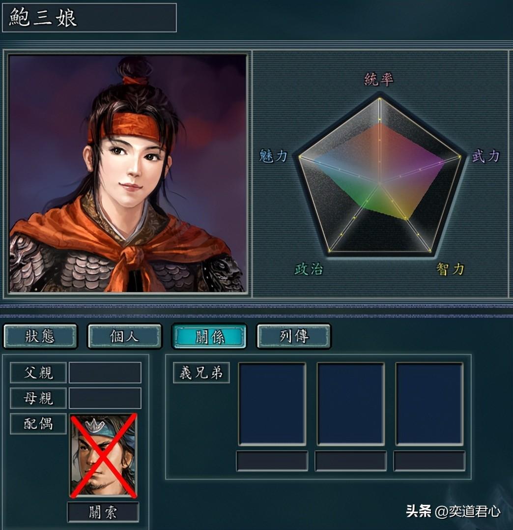 作为三国志11游戏里唯一的女性连击武将,鲍三娘最理想的如意郎君无疑是威风特技的持有者们。关索的疾驰特技固然是骑兵里的硬控好手,然而鲍三娘对于他的加持效果并不大,守寡状态的鲍三娘可以找到更好的。