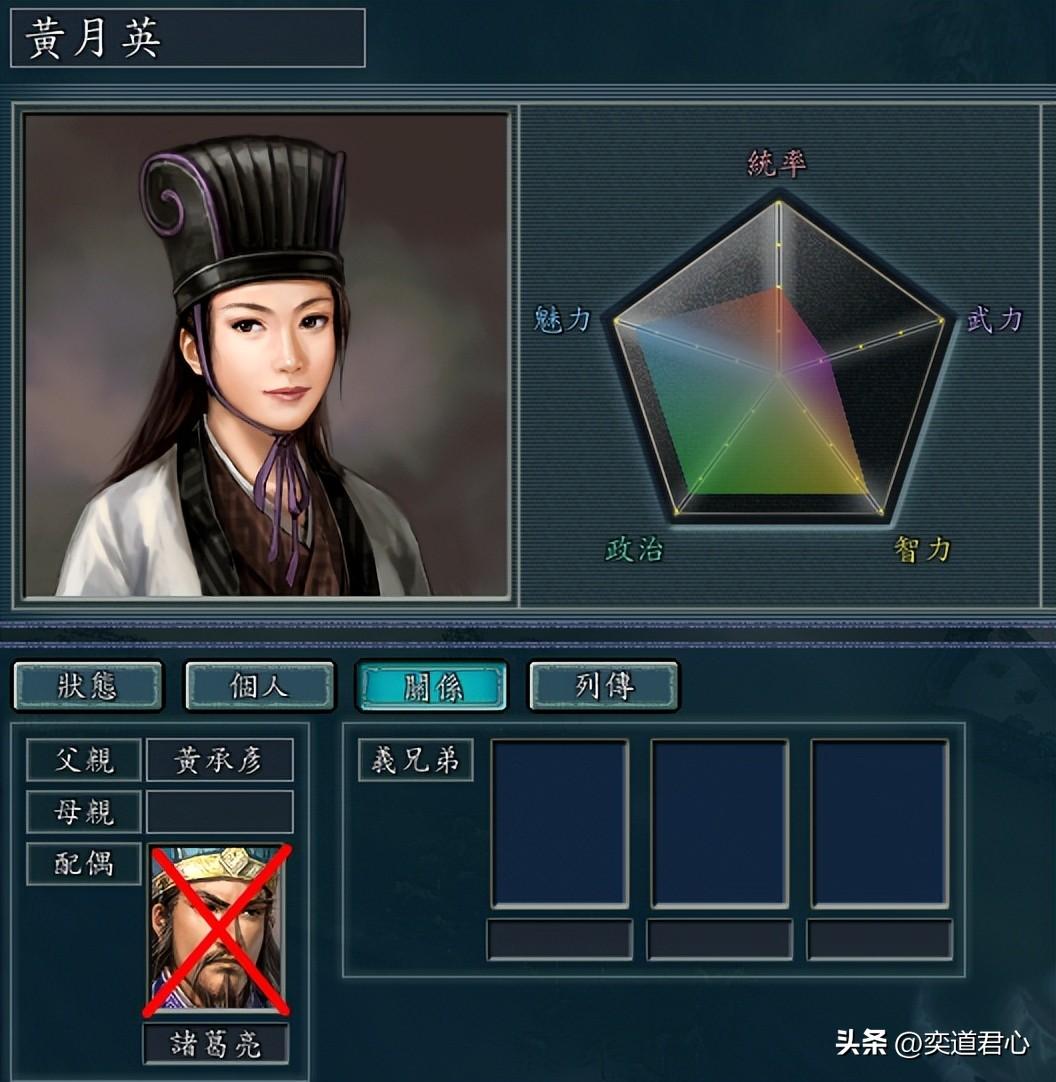 鞠躬尽瘁死而后已的诸葛亮,对于蜀汉同样是坚如磐石的忠心。不过三国志11游戏里的工神黄月英倒不像丈夫诸葛亮那么难做思想工作,只不过做她思想工作的前提,也是得先把诸葛亮给送走。尤其是到了后期,神算特技对于战场的压制力被霹雳投石等科技逐渐削弱后,你会发现工神+威风+射程才是真正的上帝。
