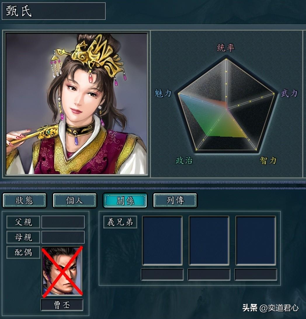 貂蝉的老公吕布就算了,即便他做人再怎么两面三刀,看在如此绝顶的武力值上,是真的不舍得碰。曹丕就显得有点匹夫无罪怀璧其罪了,自己在游戏里又没什么特别的本事,还霸着倾国倾城的老婆,不砍他还能砍谁。如果非要给曹丕一个情感归宿,自然是弓腰姬孙尚香在三国志11游戏里跟他更配,奈何刘跑跑不答应。