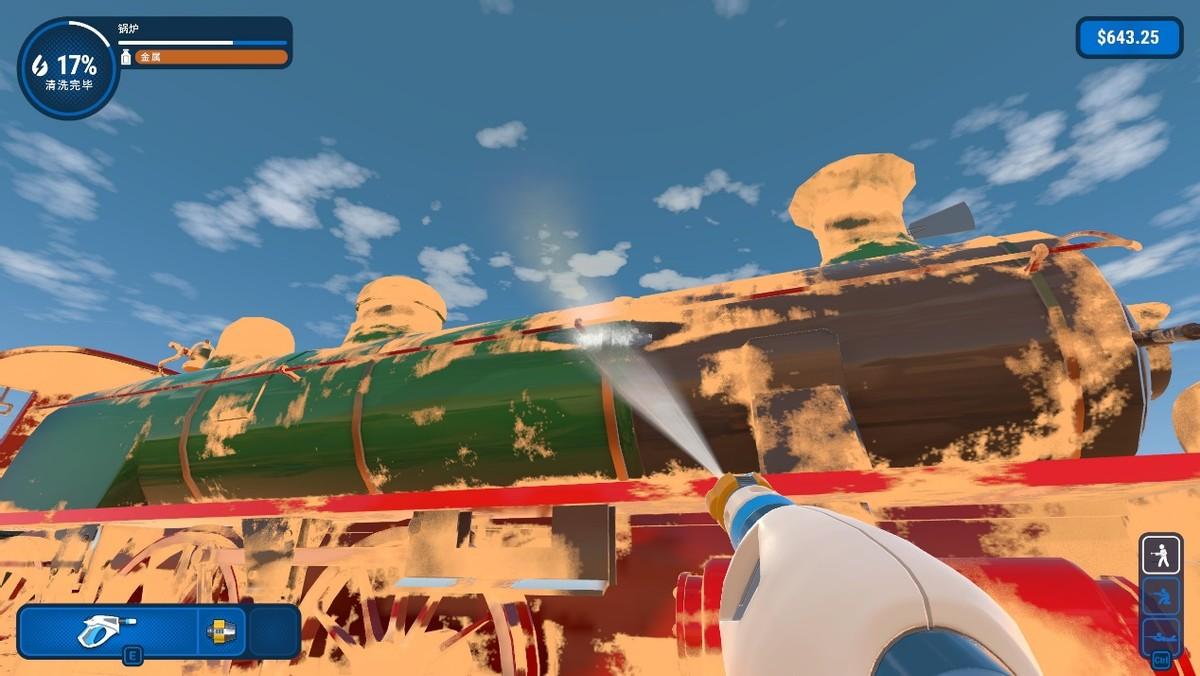 选择一个关卡,使用高压水泵清理各种污渍,每个水泵都有不同的喷洒面积,喷洒面积越大的水压越小,去污的能力也就越小。根据物体的不同切换不同的喷头或是旋转喷头。选择对应污渍的清洁液可以清洗效率。我是先用清洁液在需要清洁的地方喷洒一遍,然后用喷洒面积大水压小的水泵粗略过几遍,剩下来小面积污渍就用喷洒面积小水压大的水泵仔细清理。