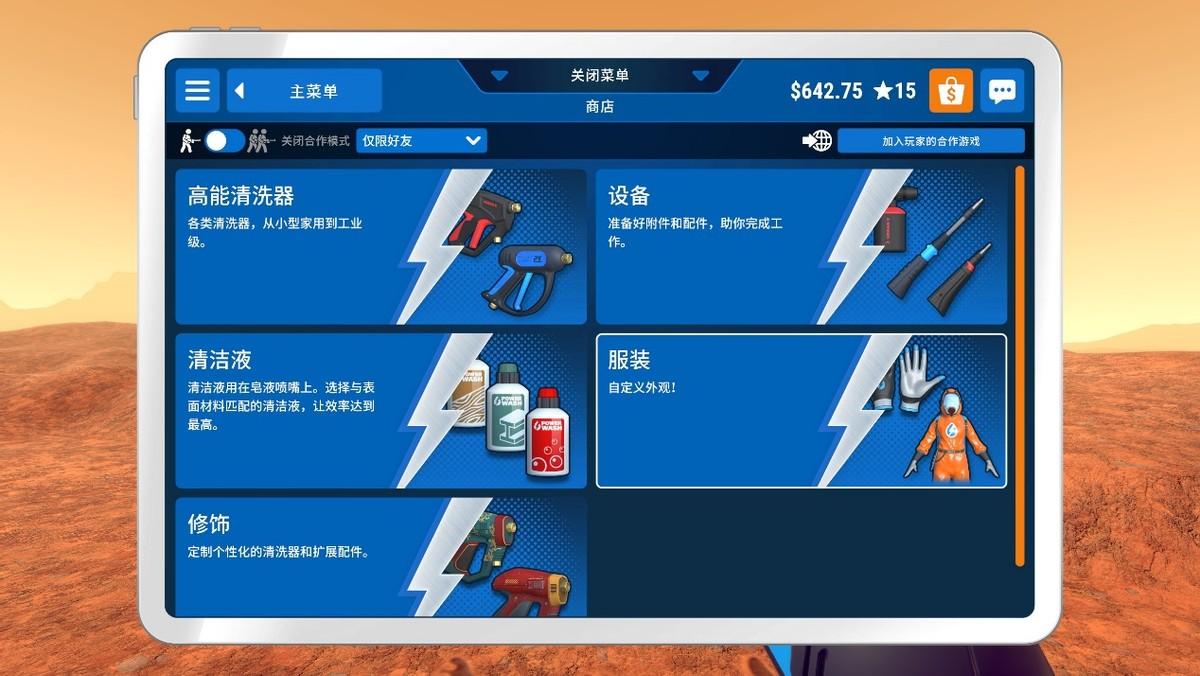 完成被委托的各种清洗任务并获得报酬后,玩家可以去商店用金钱购买更高效的清洗器、合适的设备(喷嘴)、对应污渍的清洁液以提高自身的清洗效率,让自己稍显轻松。还能购买不具备功能性的各种不同颜色的手套、衣服及水泵颜色以便于玩家个性化自己喜欢的外观。