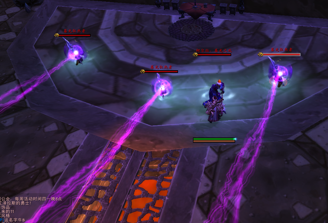 首先我们看到BOSS面前有3位跪着的【暮光狂热者】,做法很简单,嘲讽BOSS,站旁边,等待狂热者被射线充能变成进化的狂热者之后(会变大只),进行击杀,最后击杀BOSS。