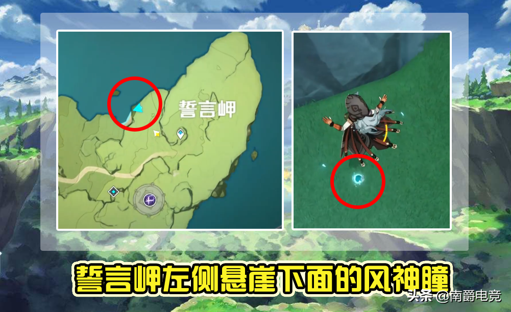 第二处同样很偏僻,位于誓言岬的悬崖处。誓言岬原本就不会经常来,要来也只是打远处的无相之雷,根本不会经过悬崖边。而这处的风神瞳要走到誓言岬左边的悬崖处,也就是图示的位置,之后要用飞行技能下降到山脚的平台处,就可以发现一个风神瞳在草地上,直接就能捡到。这里还有一个难找的原因是,在誓言岬高处时,小地图是不会显示风神瞳的标志的,只有玩家降落下去,才会在小地图上看到风神瞳的标志,所以即使玩家路过这里,也完全想不到这里有风神瞳。