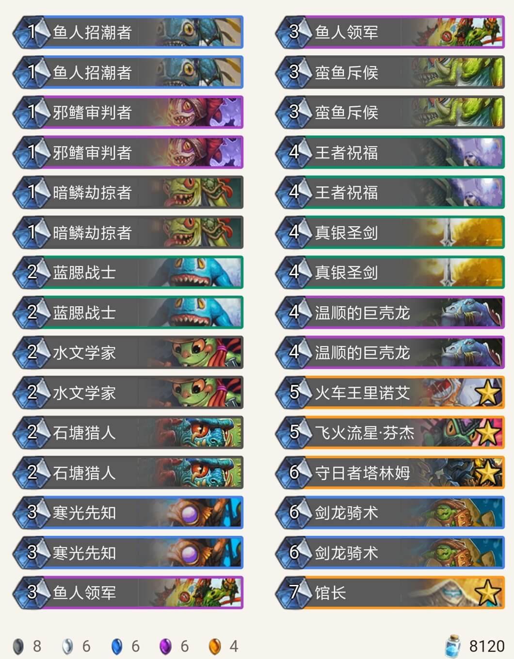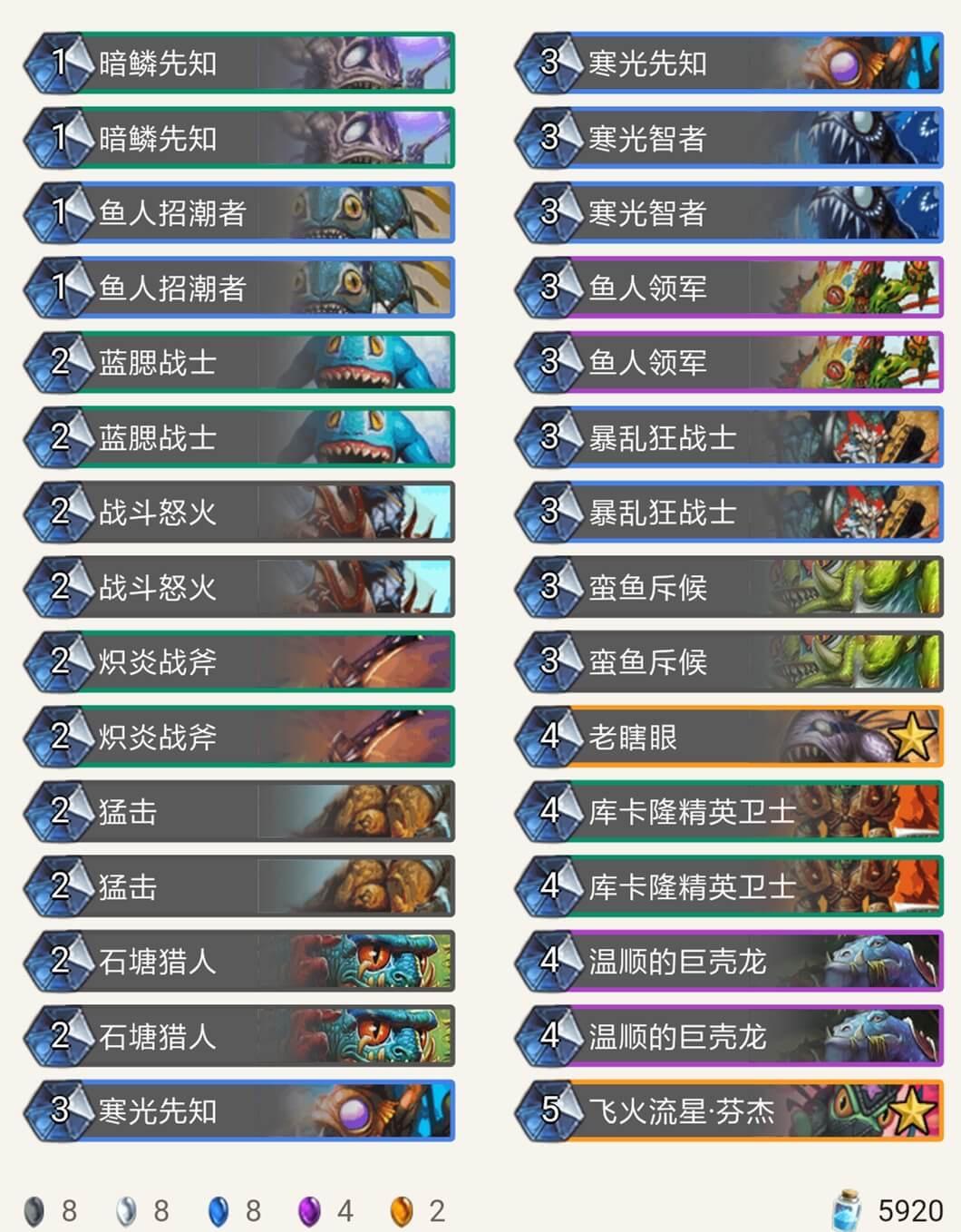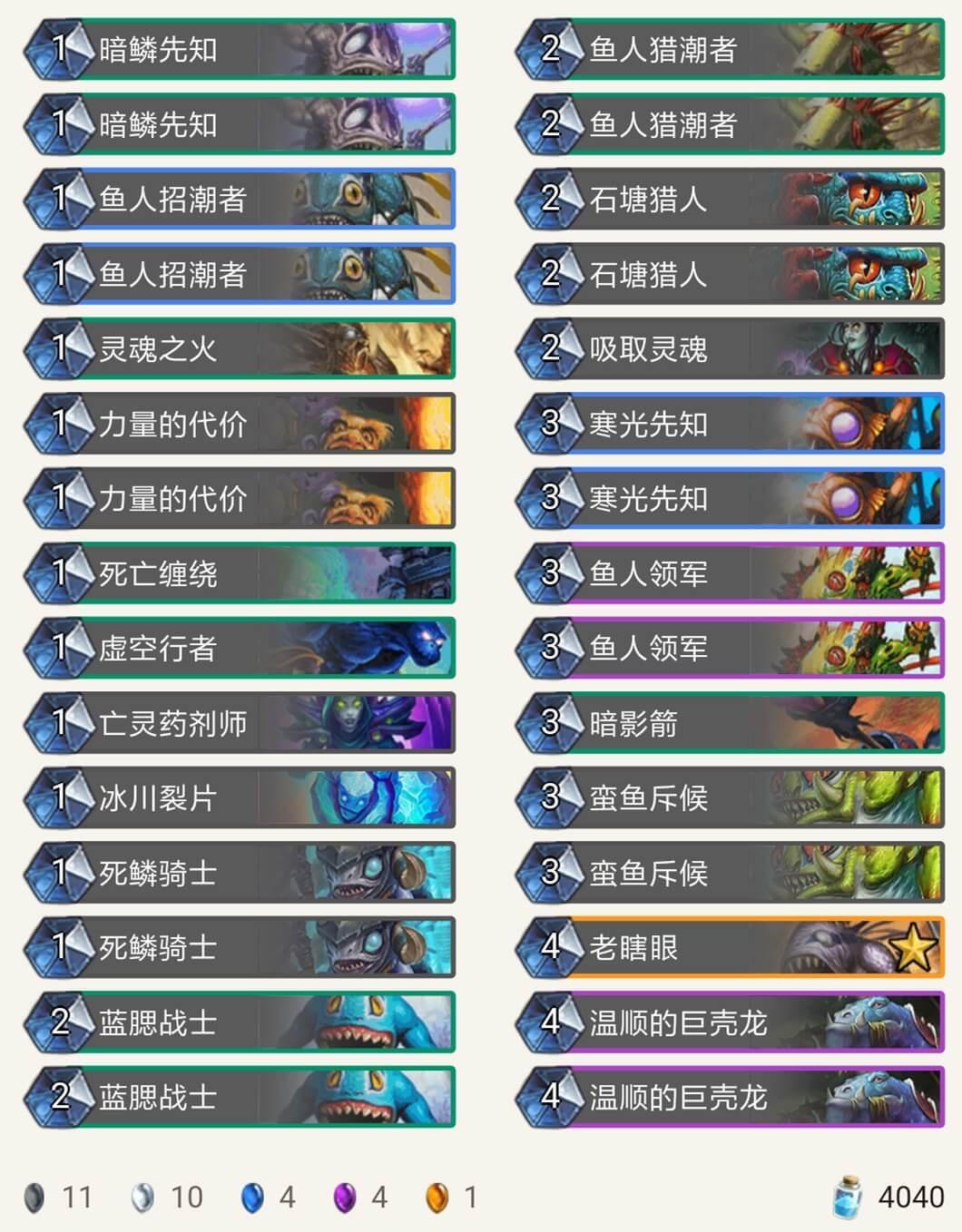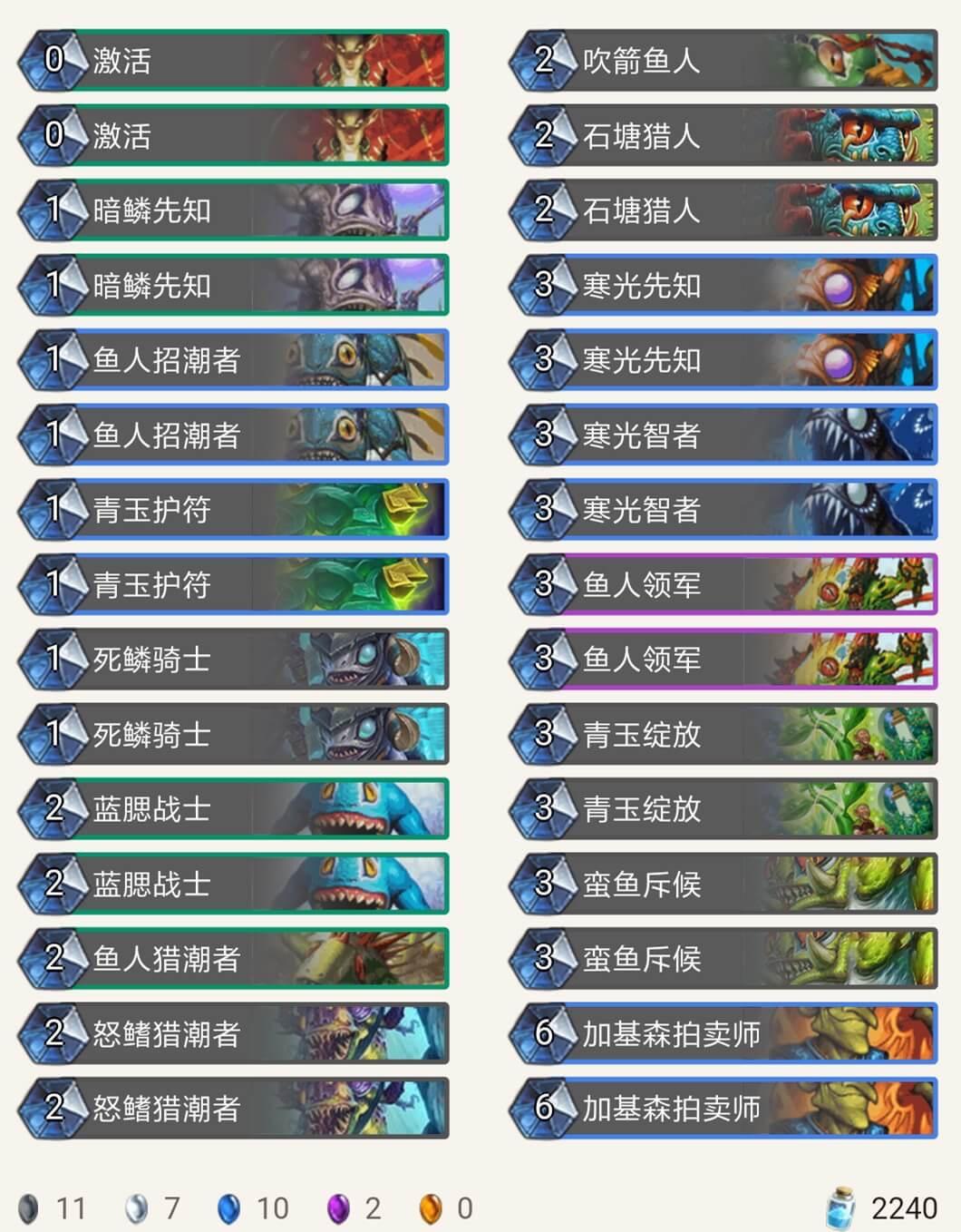 在我用9职业的各种卡组打巫妖王时,被各种摩擦,不是牌序不好就是巫妖王神抽湮灭打掉关键牌,于是我用鱼人套路,发现用鱼人套路比较好打,卡组如下