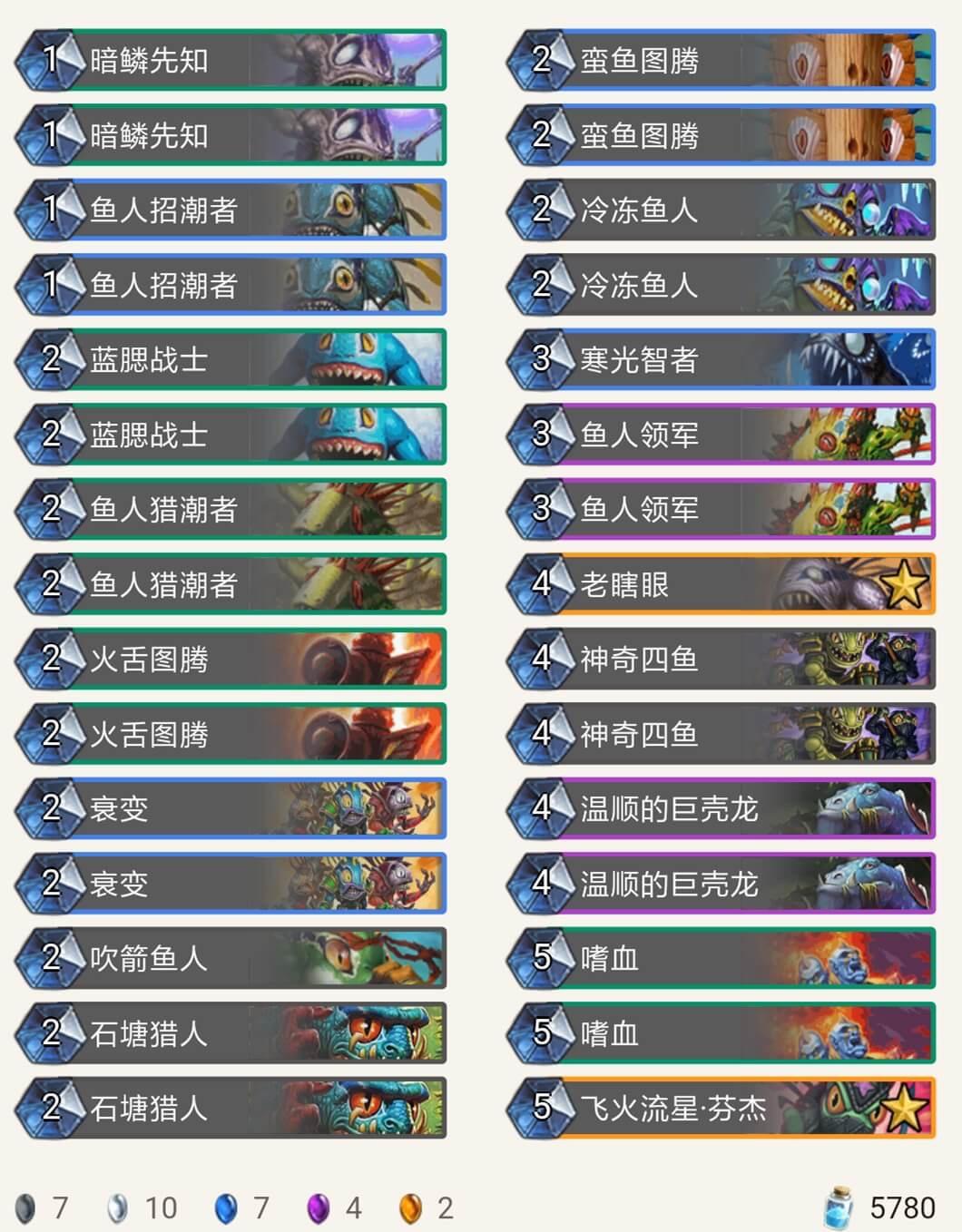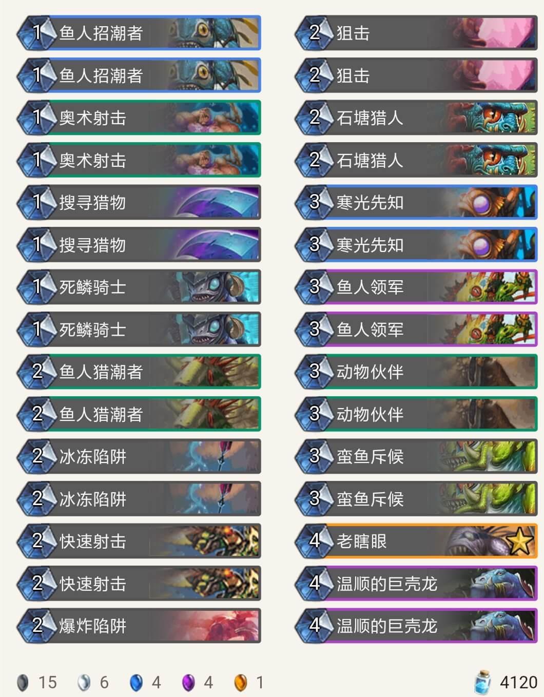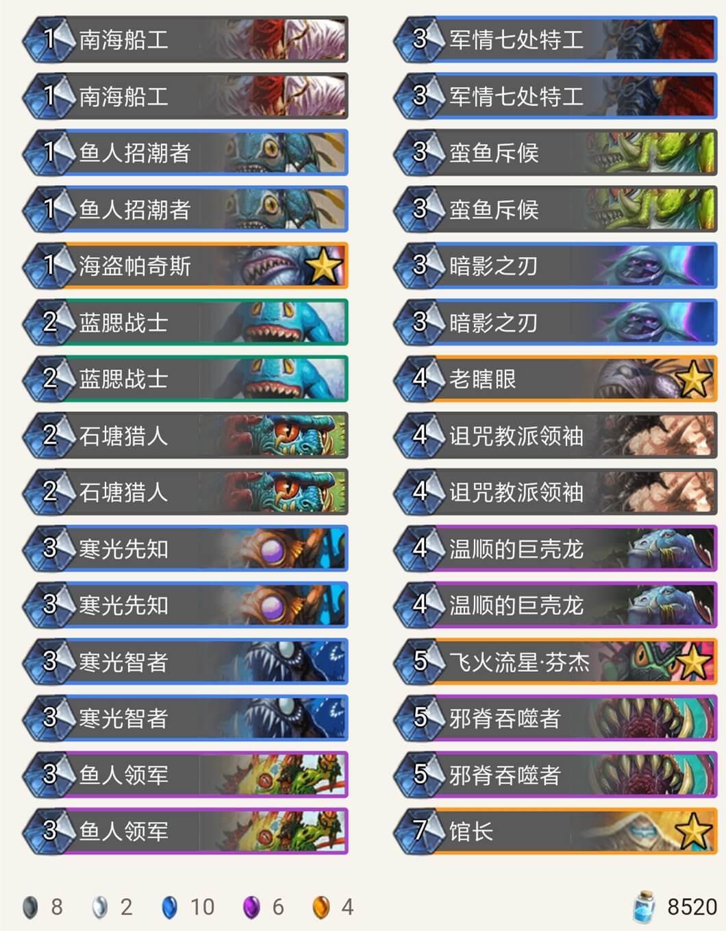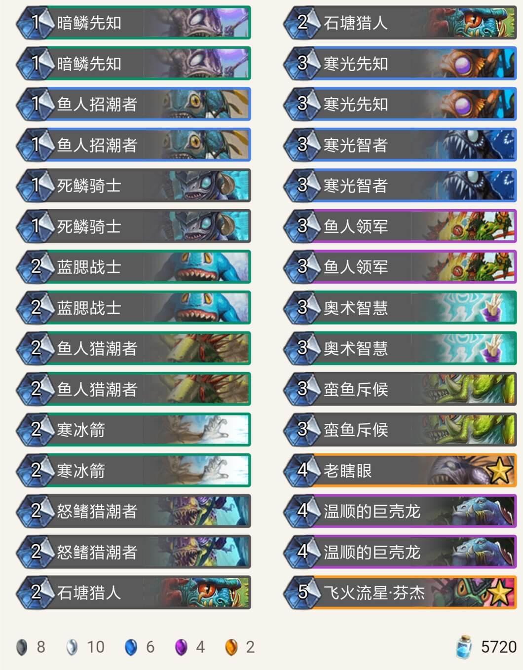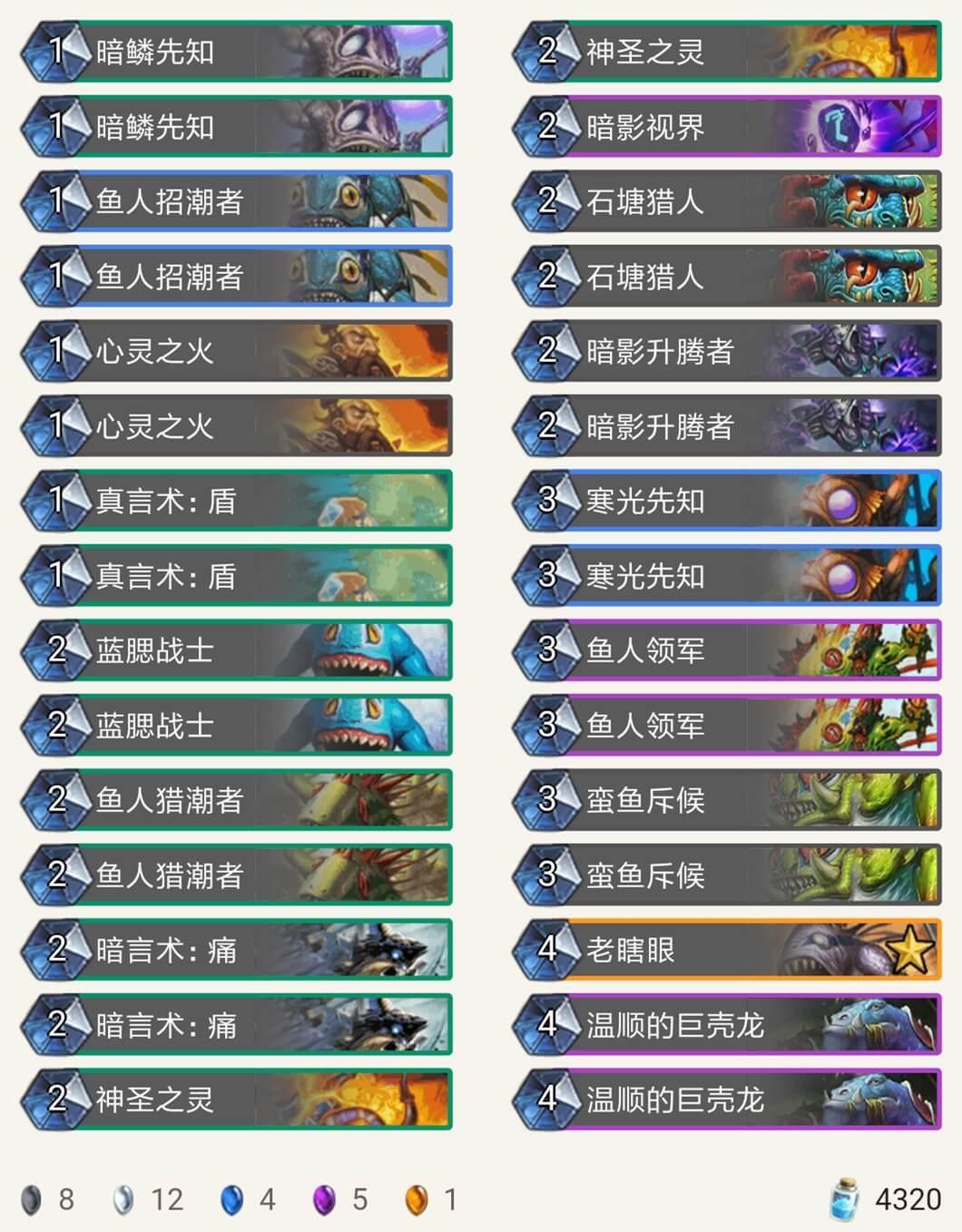 在我用9职业的各种卡组打巫妖王时,被各种摩擦,不是牌序不好就是巫妖王神抽湮灭打掉关键牌,于是我用鱼人套路,发现用鱼人套路比较好打,卡组如下