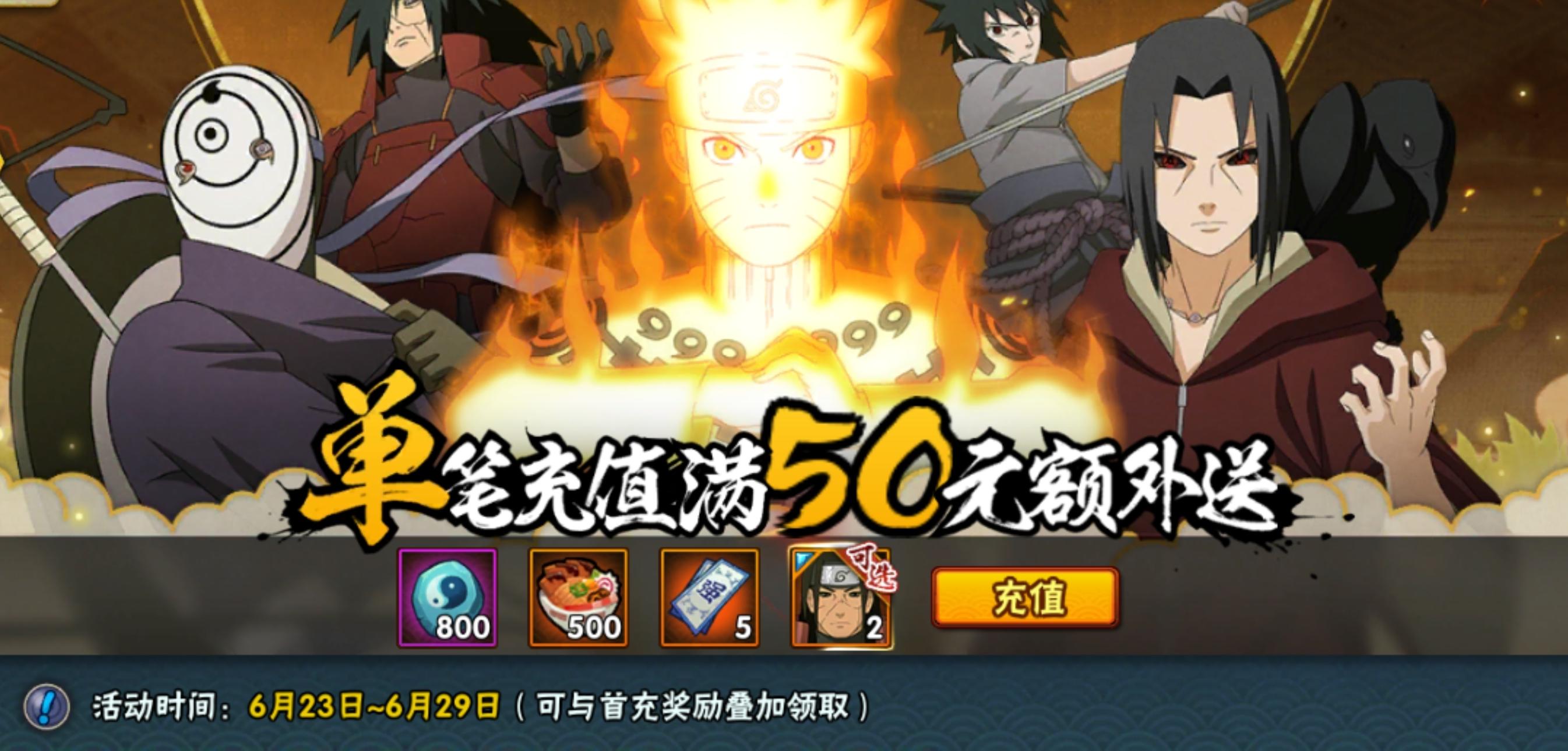 充值50元(点券或者金币)可以获得格外奖励:800忍玉、500体力、5保护符+两片自选高招忍者碎片。