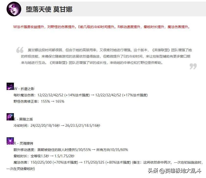 并且二三级大招晕眩时长提升,大招基础伤害和AP加成也提升,这让莫甘娜进入中后期在伤害方面也能保持一定竞争力。