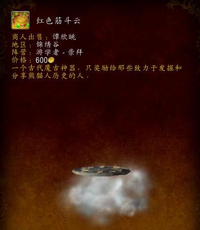 熊猫人之谜版本的坐骑,可以算是一个特色坐骑了,红色筋斗云,从坐骑图标上能看到一点点红色,骑着的时候,还真挺难发现是红色的(哈哈哈哈),上面的圆盘有点类似法师的职业坐骑,站在上面也是非常的稳,小编个人也比较喜欢这个坐骑。