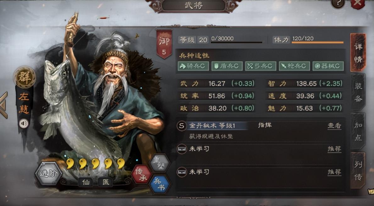 左慈的兵种面板属性简直不堪入目,也就只有智力属性看得过去,而且兵种适性全为C,好在仙人的特性可以弥补一下,并使左慈可以百搭
