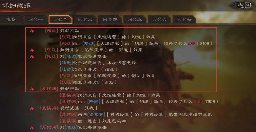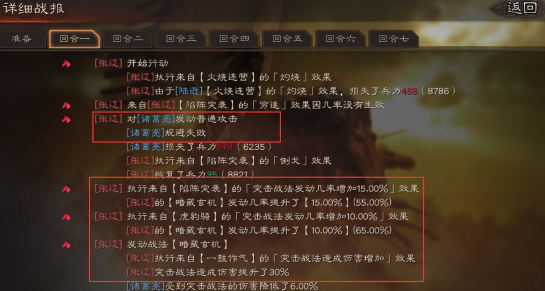 通过战报可以看出,突击战法是在普攻成功发动后才会进行判定,类似于张辽这类携带突击战法的武将,普攻打中了对手后会进行后续突击战法施放的判断,如果普攻被规避掉,后续突击战法将不再进行判定