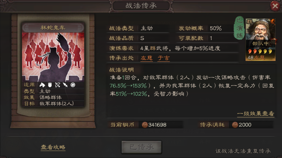 左慈传承战法杯蛇鬼车,主动战法效果为:一回合准备,对敌方2人造成伤害并为我方2人恢复兵力。伤害和恢复效果都还不错,50%的发动率算是比较高的了,是一个非常实用的战法,出场率也是非常的高。