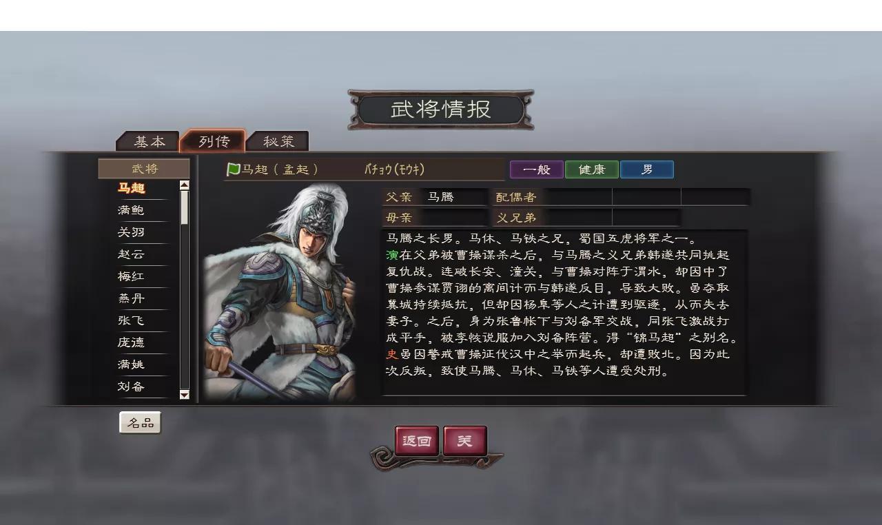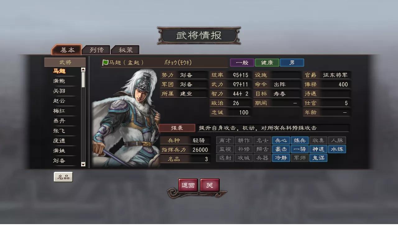 统武双高,在征东将军官衔及宝物六韬的加持下,统率达到了惊人的110,而武力也达到了恐怖的108,无论是普攻还是特殊攻击,一旦有了优良的输出环境,锦马超的战斗力绝对爆表。马超的战法强袭中规中矩,输出是超级高,但是时间太短,和刘备出征还是倾向于开刘备的义勇兵。马超的战斗技能拉满,豪杰保证了不开战法的情况下,对骑兵和弓兵都可以有特殊攻击。一骑保证了单挑的稳定性,甚至可以一回合将敌将挑落马下。神速和水练保证了马超的骑兵有更加优越的移动速度,长途奔袭不在话下。冷静则能减少被伏兵攻击后的混乱时间。鬼谋既可以隐蔽行军,又可以对敌军进行伏兵攻击,马超的高攻击甚至可以在敌军混乱结束之前让其溃败。马超是在攻掠西凉时,随他父亲马腾一起归降的,无论是打蜀地刘璋还是江东孙策,都有着优异的表现。