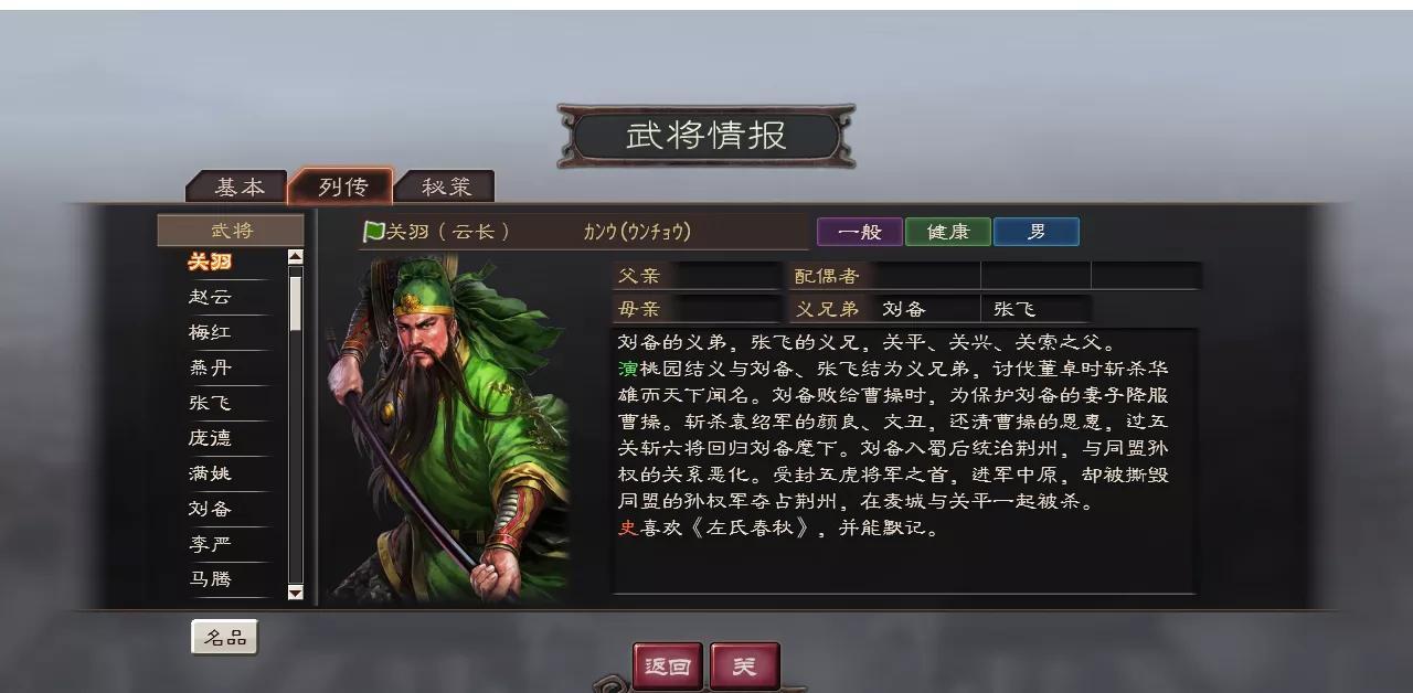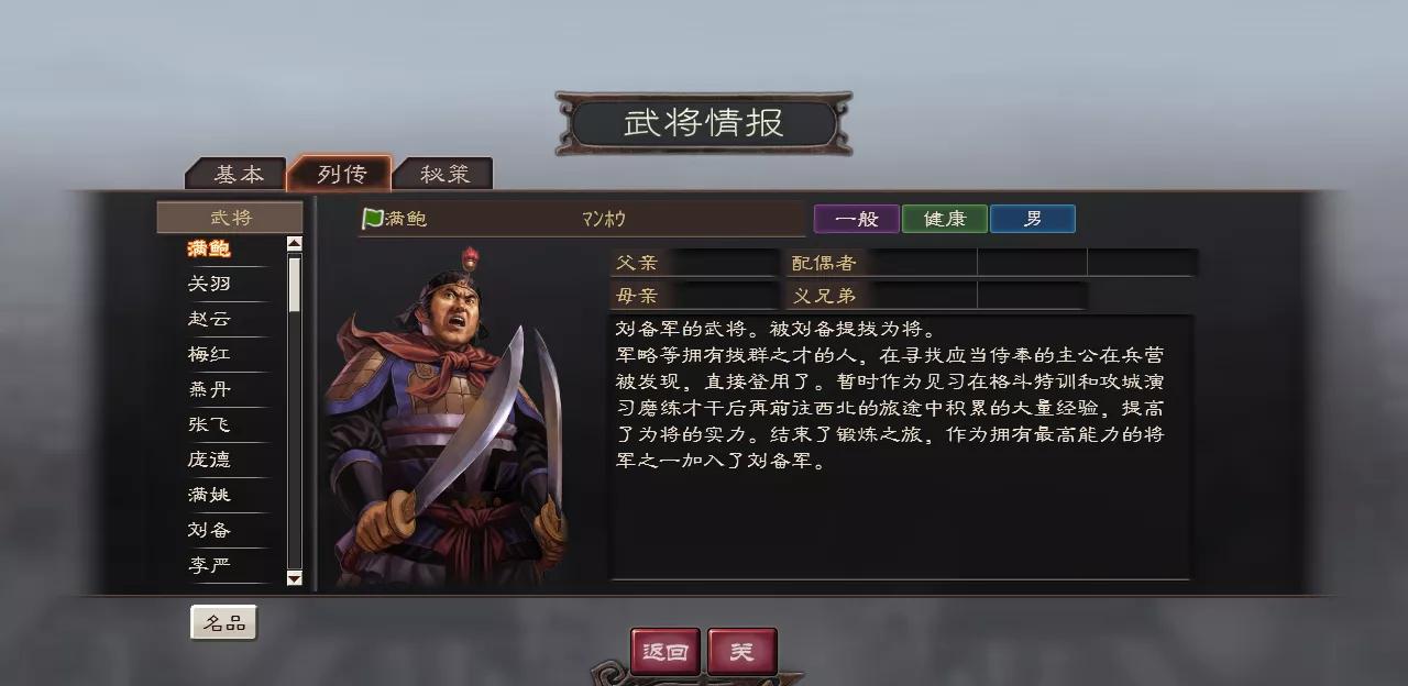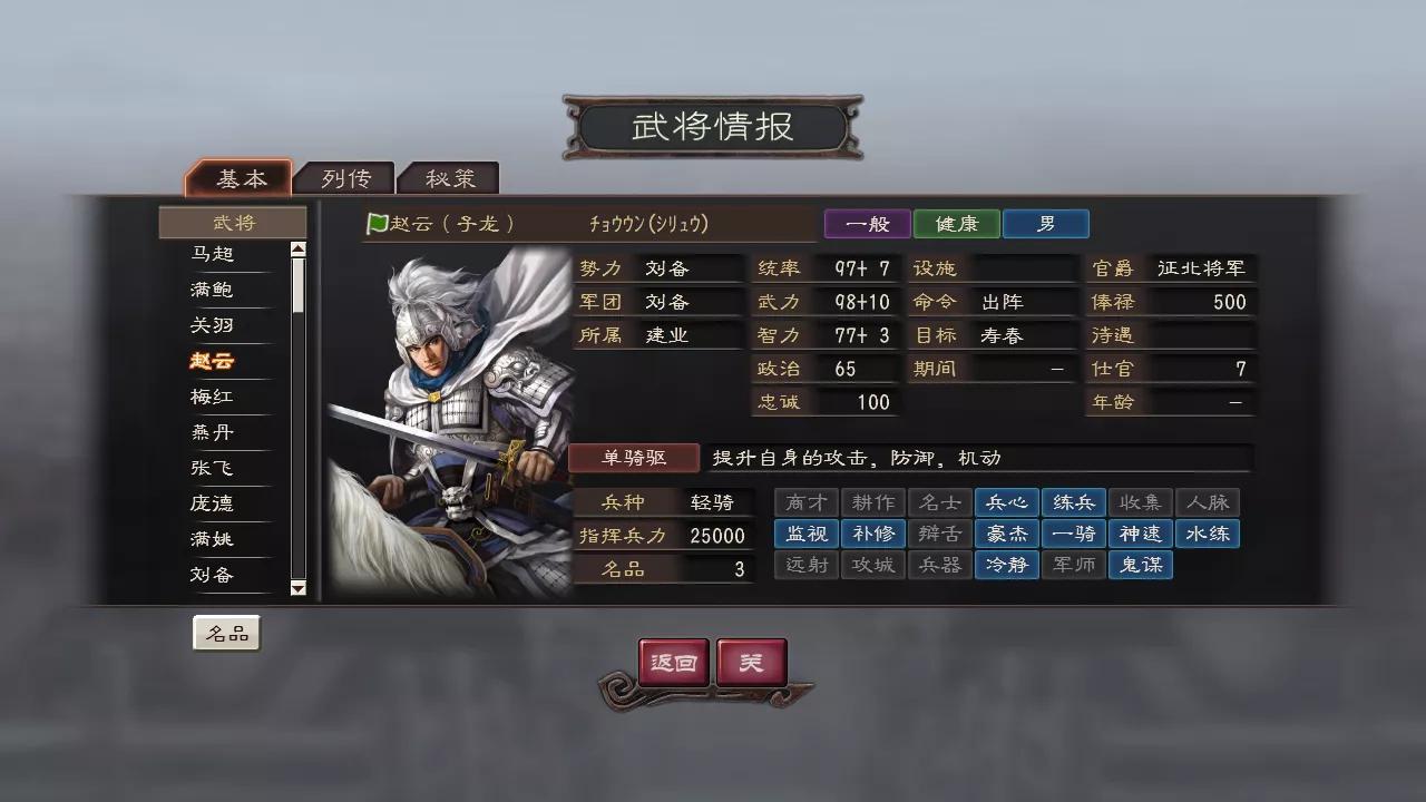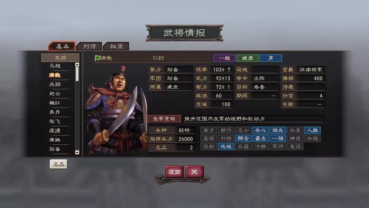 同样是统武双高,初始统率比马超还高。他是刘备拔于行伍的麒麟儿,在军中锻炼一段时间,又去西北进修后练就一身本领,本来缺少豪杰,输出略少,好在关二爷慷慨解囊,将青龙偃月刀赠与之,输出有了质的飞跃。满鲍的战法一般,但跟在刘备身边,负责输出即可。值得一提的是,本身就是枪兵的他习得攻城后,城门在他眼里就如同纸一般。