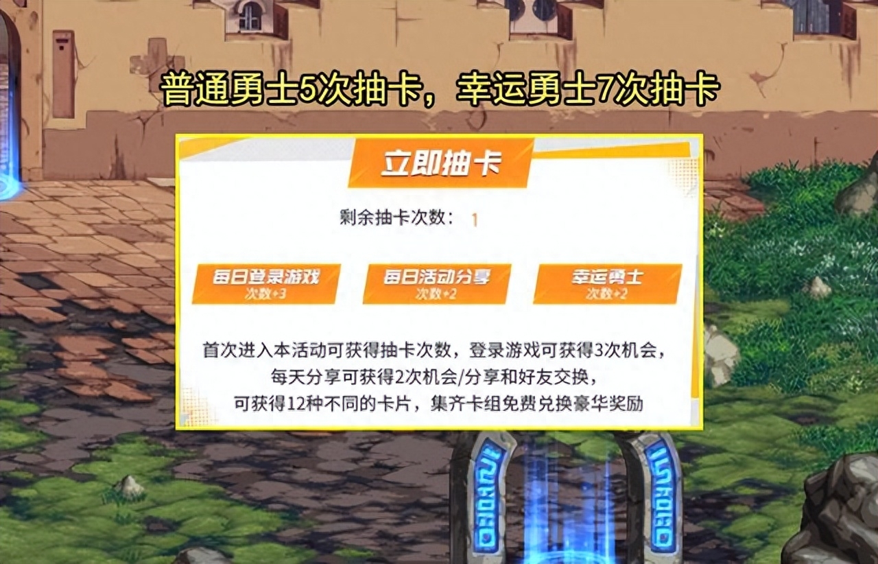 首先,和往期一样,玩家可通过每日登录游戏,分享活动,以及查看自己是否是幸运勇士来获得抽卡次数。其中非幸运勇士玩家每天可获得5次抽卡次数,幸运勇士玩家则可以获得7次抽卡次数。