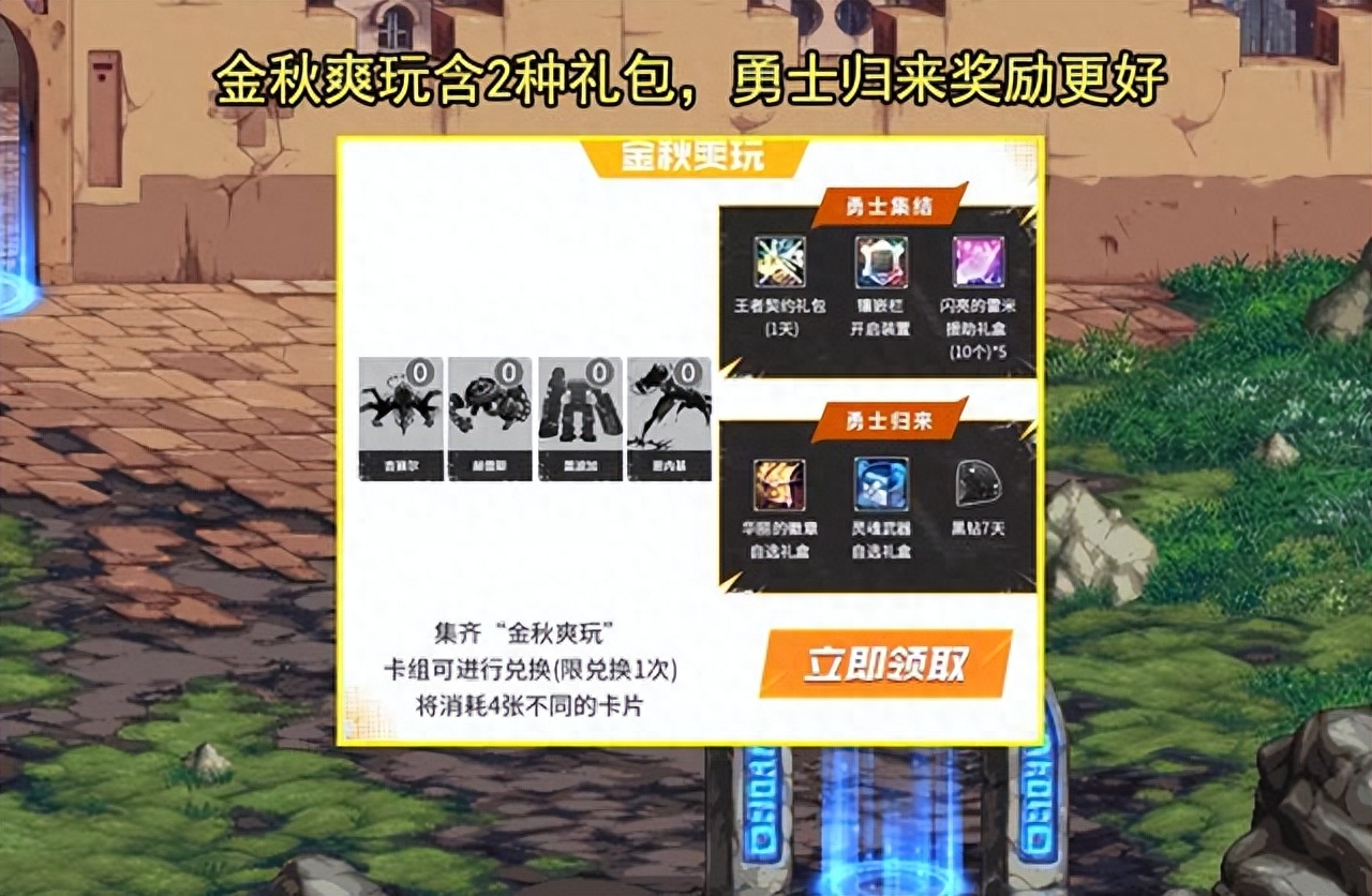 兑换奖励方面,金秋爽玩可在勇士集结,以及勇士归来这2种随机获得1种!勇士集结可获得王者契约礼包(1天)、镶嵌栏开启装置,以及50个闪亮雷米,勇士归来则可以获得华丽的徽章自选礼盒、灵魂武器自选礼盒,以及7天黑钻。从这2种奖励可以看出“勇士归来”更好一些,不过一般需要回归玩家才可以领取。