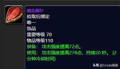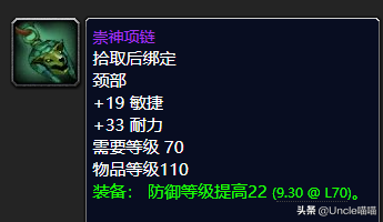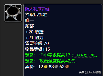 命中,无论是法系还是物理系输出甚至是我们的T来说前期对于命中的达标都是要求很高的,你没有一个稳定且合格的命中的话那么基本上输出会落下别人一大截的。而这款物理系的极品项链前期来说就是你非常的值得入手的东西,性价比非常的高。20点的敏捷已然超强水准直戳天花板,18点的命中等级提高也是让人无话可说直呼高端,42点的攻击强度来说真心不错,虽然说它和我们卡拉赞BOSS猎手阿图门出品的狼人利爪项链基本一致。