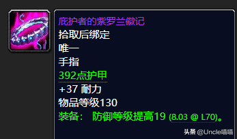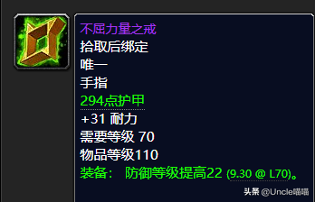 这款294点超级绿字护甲、31点超强耐力以及22点高级防御等级加持的前期极品戒指喵叔强势推荐我们的熊T玩家入手,基本上前期P1阶段的话你入手这个戒指以及卡拉赞的声望戒指来说基本上已经毕业了。