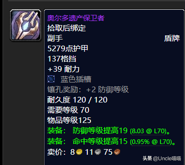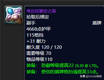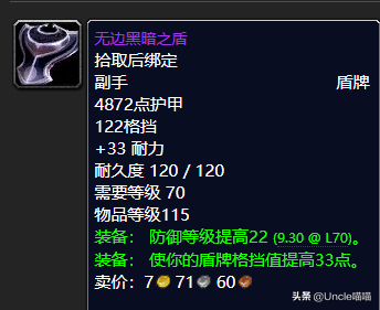 这块盾牌来说的话真的是非常的不错的,高性价比,而且就前期而言的话盾牌其实入手还是挺难的,掉率的话也是非常的低,你比如说卡拉赞BOSS夜之魇出品的无边黑暗之盾我至今没见过。