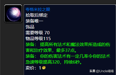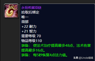 这款经典的高智力高耐力自带回蓝的治疗颈部项链的话,前期还是非常值得我们的奶骑或者是萨满玩家入手的,非常的好,就48点的法术治疗提高来说无论如何都让人觉得高端,而且项链这东西本身也少的前期,你比如说格鲁尔的格鲁尔之牙。