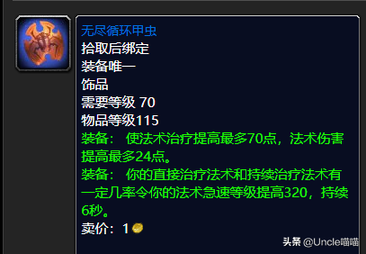 治疗前期的高法术治疗提高饰品堪称极品了,我想懂行的治疗玩家都应该懂吧,一般前期属性以及各方面加持稳定之后,那么我们的纯法术治疗提高就显得非常的重要了,这款饰品搭配上我们黑色沼泽出品的无尽循环甲虫一起使用最为经典。