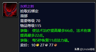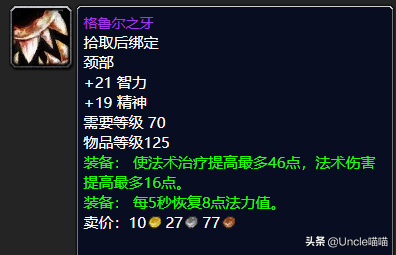 虽然说格鲁尔之牙的回蓝高带精神,但是其实就性价比来说个人还是喜欢我们的永恒希冀项链,耐力相比较于精神而言的话对于奶骑或者奶萨来说还是耐力好点,保障了自己的生存能力,而且一般也没有奶骑、奶萨去堆精神的。当然如果你追求极致法术治疗的话那么就入手卡拉赞BOSS夜之魇出品的灰烬之刺。