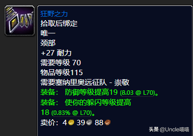 这款高耐力带敏捷高防御的项链的话最适合的肯定是要属于我们的熊T玩家了,所以前期还是非常的值得入手的,当然如果你牌子少或者说是有别的想换的话,那么久兑换塞纳里奥远征队声望崇敬获取的狂野之力。