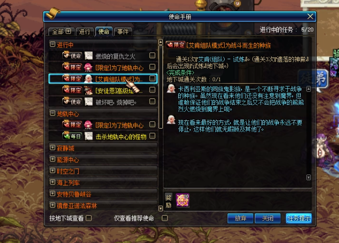 现在只要我们进入艾肯地下城与勇士,就会自动接取到这个限定任务,而不是改版前只有进入了试练地下城才会出现任务的接取,这样可以避免我们忘了接任务,导致拜拜刷了却拿不到奖励。但是这个便利性的改动,有一点大家一定要小心,否则还是拿不到奖励的。