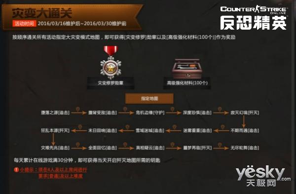3月16日维护后至3月30日维护前,按顺序通关第三季到第五季的十五章大灾变地图,就可获得100个高级强化材料和【灾变修罗】勋章!