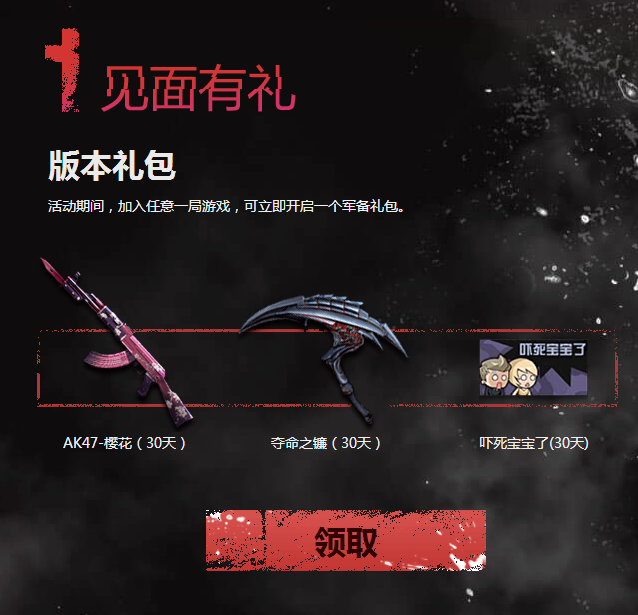 活动一:见面有礼,所有玩家来到活动界面都能一分见面礼,道具有夺命之镰(30天)、AK-47樱花(30天)以及“吓死宝宝了”名片30天,喜欢的玩家请游戏一局后去活动页面领取,相信很多玩家都喜欢夺命之镰,毕竟生化必备!