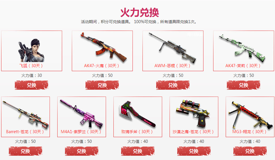 活动期间积分达到一定数量即可获得相应的道具,本次兑换并没有数量限制,只要达到相应的活力值即可百分之百兑换道具,但是每个道具都只能兑换一次,有飞狐(30天)、苍龙大炮(30天)、道具卡,还有永久的暗之假面和火线币均可兑换!