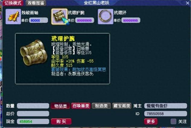 看到上面摊位上所出售的这件召唤兽装备了吗?上面的这件召唤兽装备用着高级冥思的套装,而且还减少了55点伤害,现在却摆了9,999万的价格,在该摊位上还有同样价格摆着的另一件装备,正常的情况下一套召唤兽装备应该是护腕、速度,还有衣服,现在衣服已经消失了,是不是被别人9,999万的价格给买走了呀?如果真的有人在该摊位上以9,999万的价格买走这种装备的话,小编建议各位玩家向系统进行申诉,多花的钱是可以找回来的,上面的这种摊主也会受到处罚。