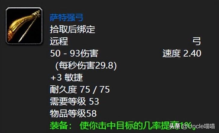 厄运东瑟雷姆刺蹄的萨特强弓可以说是小号战士和盗贼必备的顶尖远程武器了,毕竟1%的击中目标几率提高无论如何都是初入60的你必备加持,刻骨铭心那是必然的,更何况喵叔的战士小魄甲可是硬生生找个大佬带刷站桩了一个下午才拿到,遥想当时,该大佬都郁闷了,为了这几个金币竟然和我两人在厄运混了一下午,那毅力我们都佩服自己!