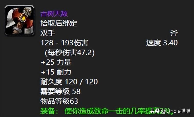 厄运北戈多克贡品开出的古树天敌可以说是60年代少数不多极颜值与实力于一体的双手斧了,这东西热爱武器战在意颜值的战士大佬必然是要肝上一款的,当然有一说一,古树天敌这东西猎人拿着用也是真心的不错的。喵叔也是咨询过几位佩戴过的大佬,均表示就过渡而言真的可以,输出丝毫不弱好吧!
