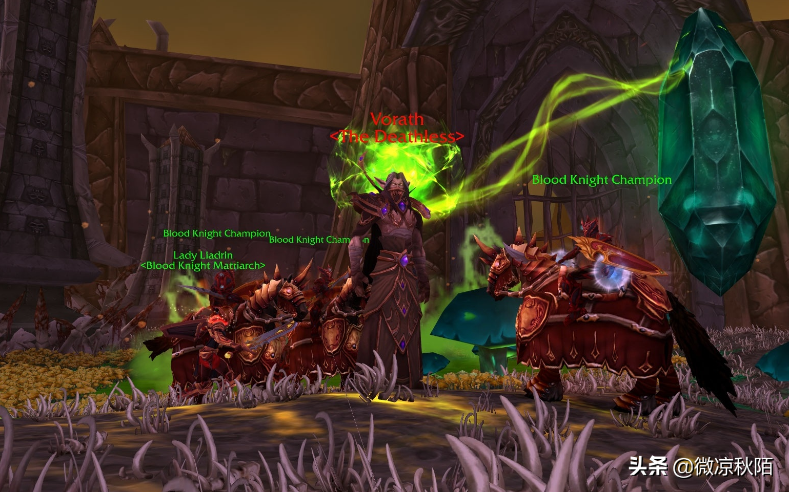 暗影界的时间流不同于艾泽拉斯,这大概可以理解为在暗影界感觉过去了很久,而在艾泽拉斯可能只有几天时间。所以,玩家在暗影界击败典狱长之后,回到艾泽拉斯,衔接上的就是失去统御之盔控制的天灾军团,而最先净化天灾的剧情则是来自血精灵的传承任务,玩家将获得一件经典的血精灵传承武器,并且顺利打断了天灾军团再次肆虐的源头。