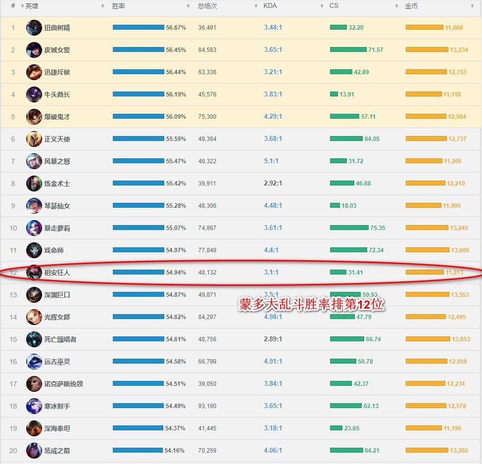 OPGG显示蒙多大乱斗胜率排第12位