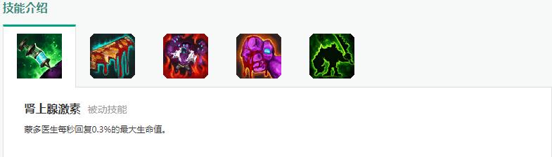 蒙多每秒回复0.3%的最大生命值,跟盖伦的被动类似,虽然没盖伦回的多,但不同于盖伦的是蒙多在任何情况下都能享受被动的生命值回复,在后期蒙多至少有4000血情况下每秒提供12点生命回复(还没计算基础回复和振奋加成)。