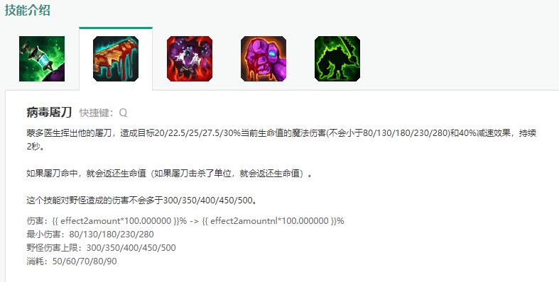 蒙多医生沿直线投掷病菌屠刀,对目标造成相当于目标当前生命值的的魔法伤害,并使目标减速40%,减速效果持续2秒。