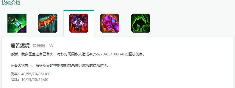 W技能拥有类似日炎的高额持续伤害,通过W技能的灼烧使得蒙多团战AOE持续输出能力更强。且一级W就能使所受的控制技能效果减少30%的持续时间,这个改动让蒙多从前期开始就控制不住了,配合水银鞋以及符文点出韧性让蒙多化身为老版本刀妹,成为控不住的团战搅屎棍。