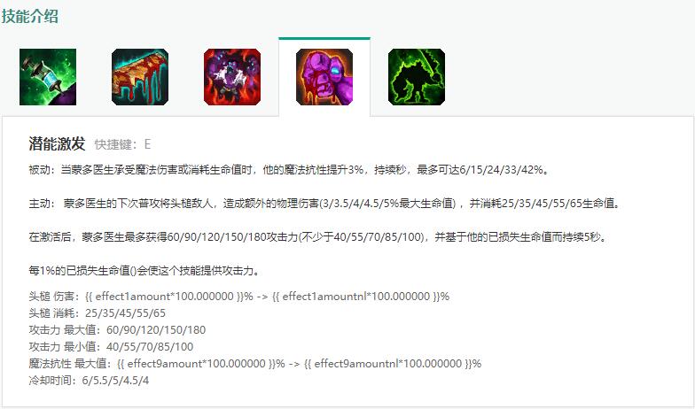 蒙多物理伤害来源于E技能的高额攻击力加成,E技能最高能提供180点攻击力,这个加成在前中期让蒙多对拼丝毫不虚任何一位英雄。E技能被动百分比魔抗加成就是蒙多吊打法师的资本,在全程开启W的情况下能保持满层E技能被动,满级E提供42%魔抗加成让蒙多受到魔法伤害大幅减低,且满级E仅仅4秒的冷却能保证蒙多每场团战下来E技能攻击力加成不间断!