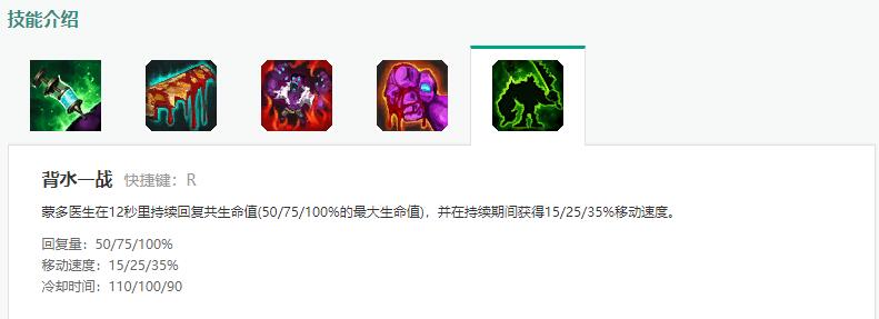 大招是蒙多想去哪就去哪的资本,三级大招即使在受到重伤的情况下也能回复60%最大生命值血量,保证蒙多在团战中一直回血并不死,注意!R技能不要在残血的时候开启,大招会减少25%当前生命值,残血状态下很容易让敌方抓住机会集火秒杀。大招12秒35%的移速加成让你走位灵活,追击更轻松。一级大招在没有振奋的情况下开启回复量并不高,不要太过于相信蒙多前期的坦度,毕竟蒙多是承受伤害+10%的猛男。
