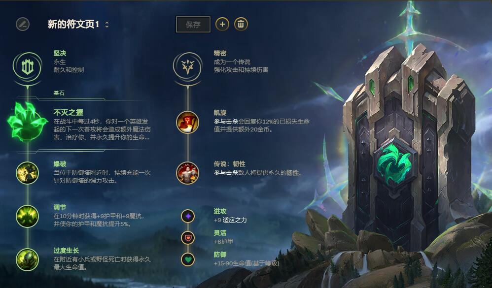 对于蒙多在符文的选择上很简单,队伍坦克多点征服者,没坦克就点不灭。征服者为蒙多提供持续作战能力,开启W接QAEA能很快速触发征服者效果。不灭则强调增加血量坦度,在对拼的时候有更多回复手段,帮助队伍抵挡更多伤害,点出爆破在蒙多高血量时拆塔很快,加速游戏节奏。