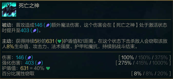 被动:普攻造成额外伤害,在死亡之神状态下普攻造成巨额伤害。