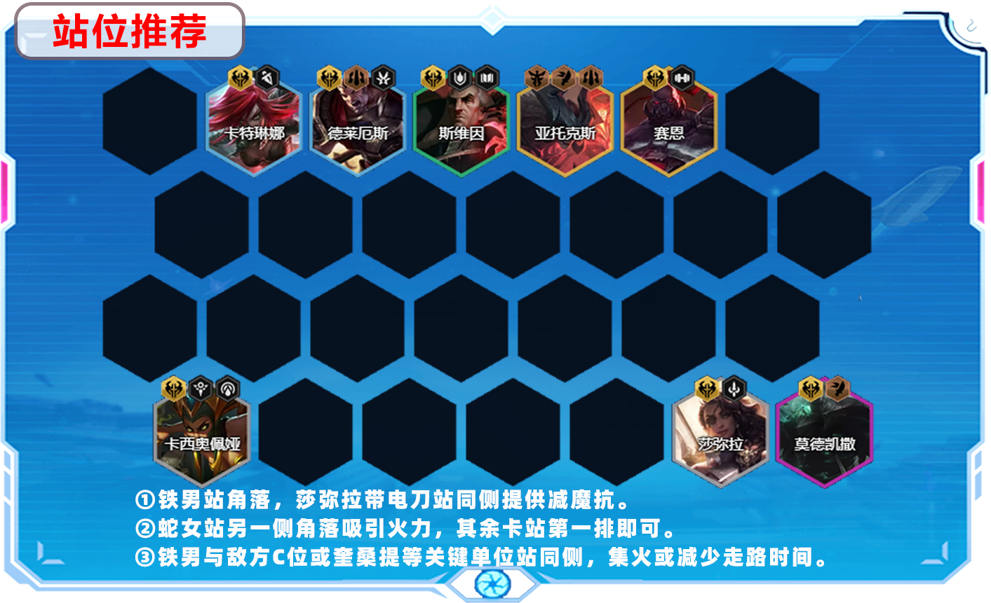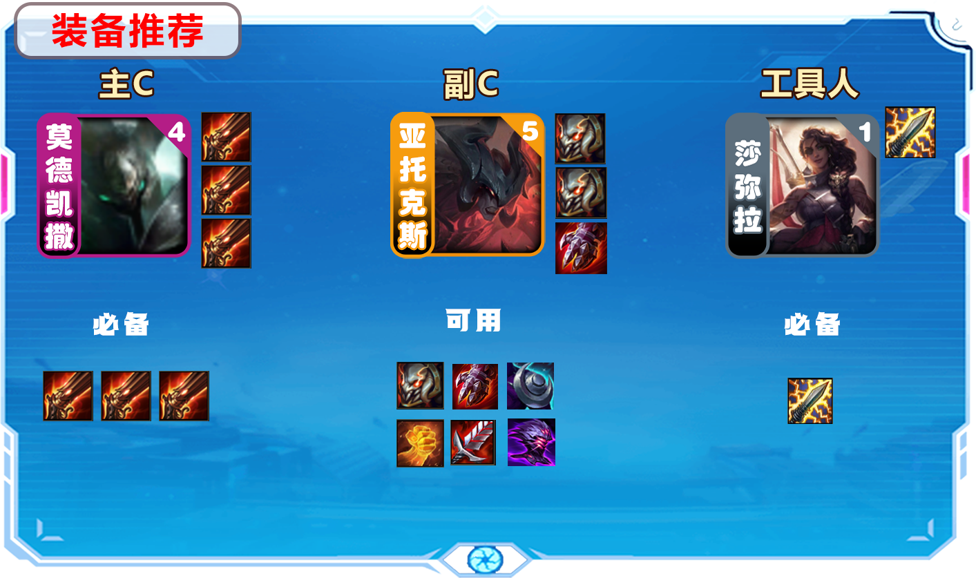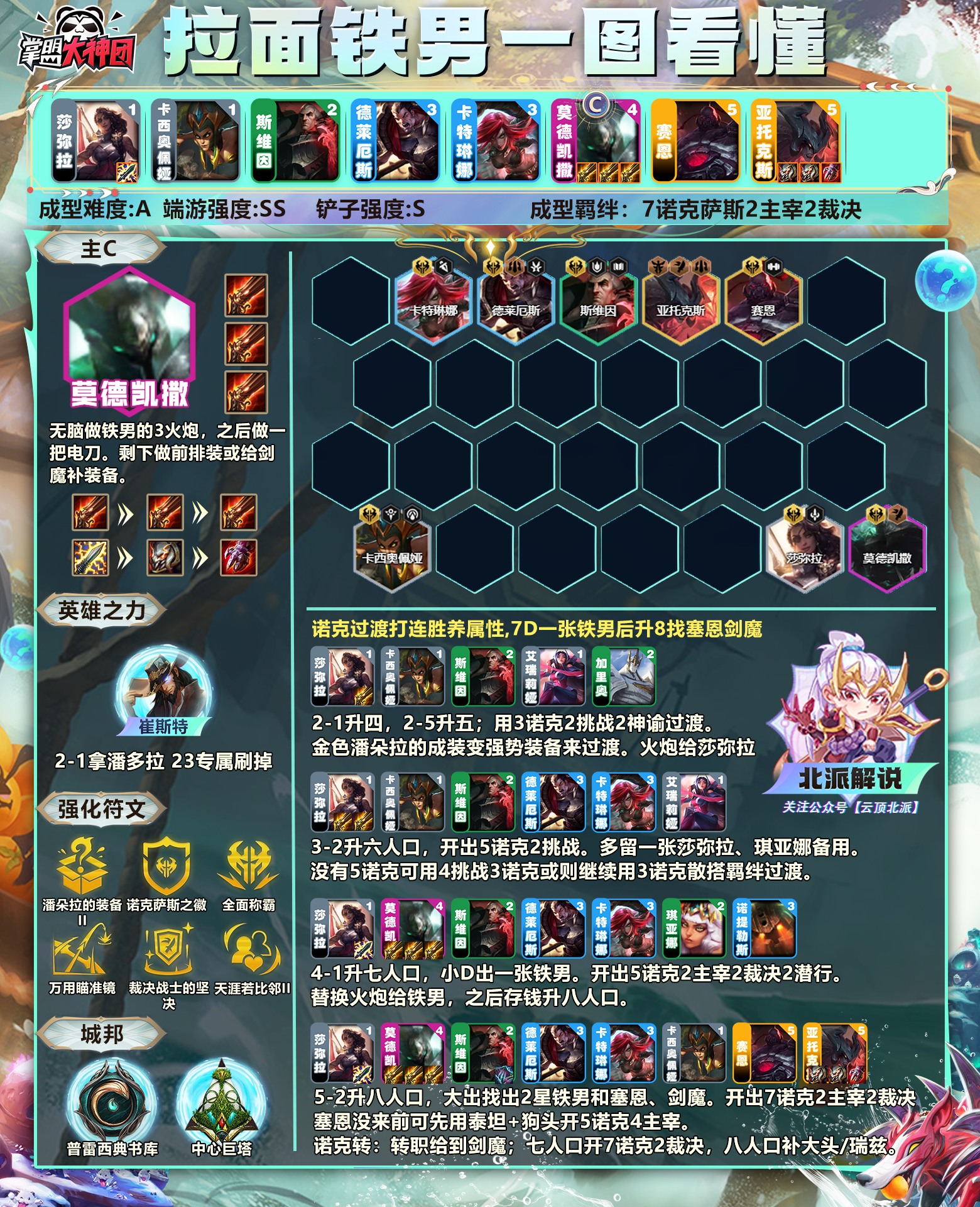 在被动技能和窃取属性下,铁男不缺伤害。所以出装方面选择3火炮增加生存环境,还能减少走路时间。在阵容上搭配7诺克萨斯,叠满的诺克单位都可以获得675生命值和高额法强加成,再补出剑魔开出2裁决2主宰。