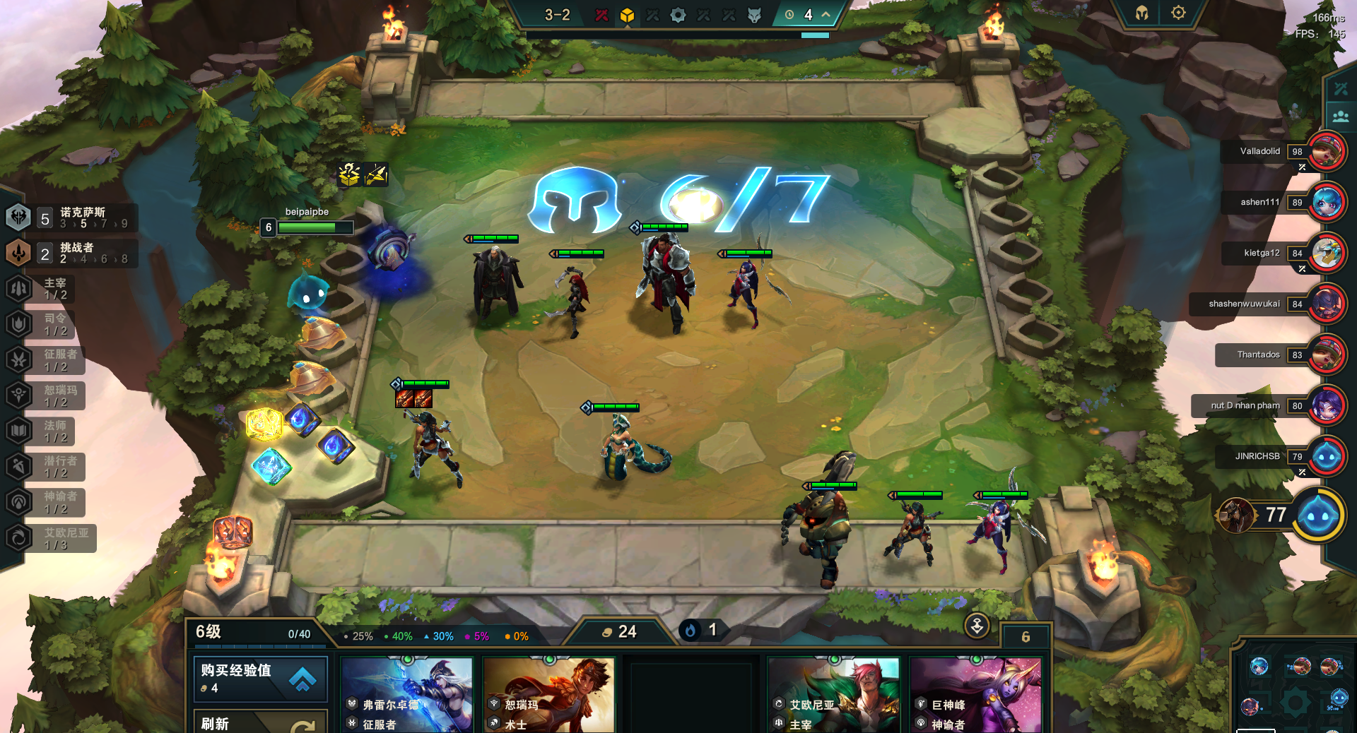 阵容核心为7诺克和铁男的三火炮。用诺克+挑战过渡到7人口,小D出一张铁男后升八人口找塞恩开7诺克。没有塞恩可先用5诺克4主宰。