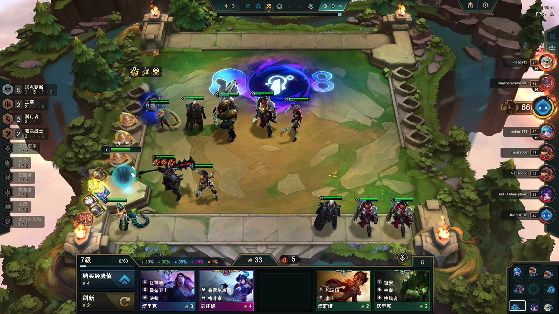小D出一张铁男,搭配琪亚娜+泰坦组成5诺克2主宰2裁决2潜行。之后存钱升八人口。