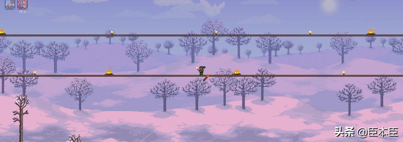 场地:长100~200,3层左右左右,每格高6.7格左右(用史莱姆坐骑打的话就搭高一点方便跳跃),在平台上放置一些篝火,篝火会加快生命回复