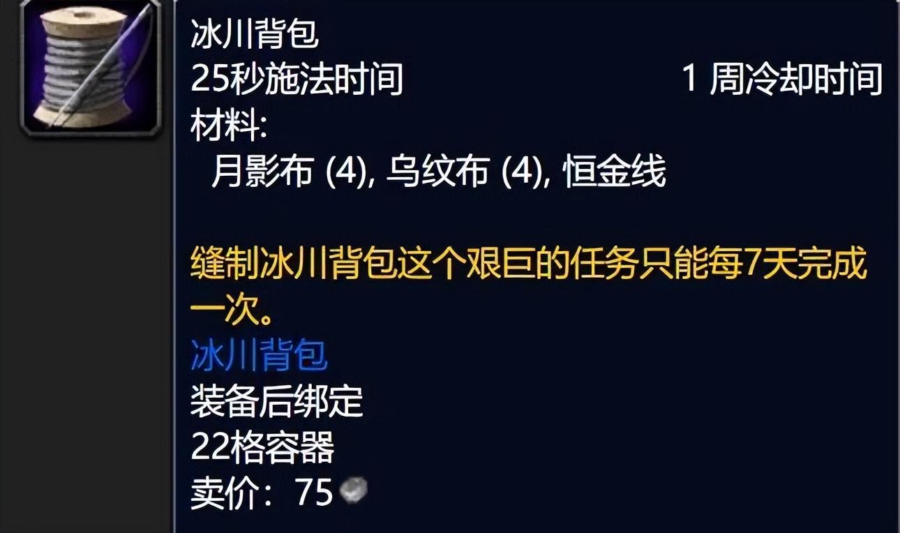 另外裁缝还有一个制造CD为一周的22格背包可以赚点代工G,不过购买图样需要霍迪尔之子崇拜,小号就别想了。