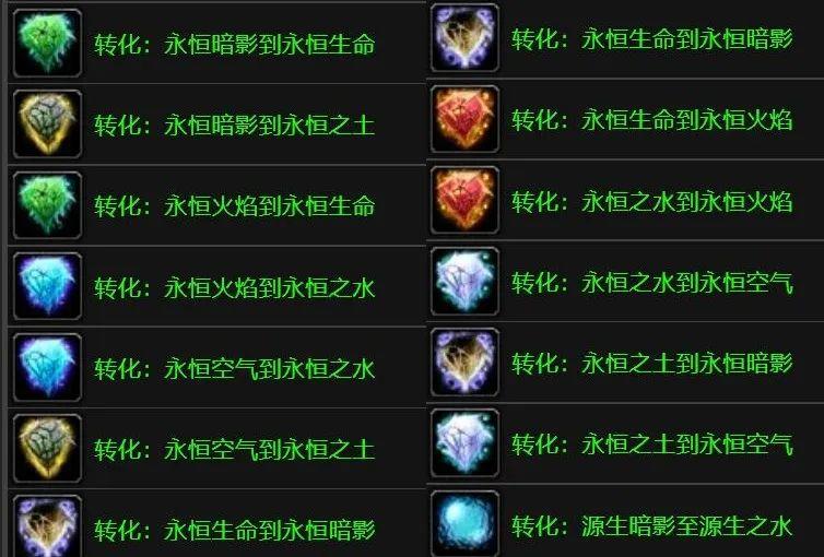 T9阶段(3.2版本)开放后新的史诗品质宝石加入了游戏,炼金可以把精良品质宝石转化为史诗品质的宝石,6种转化配方共享20小时转化CD。